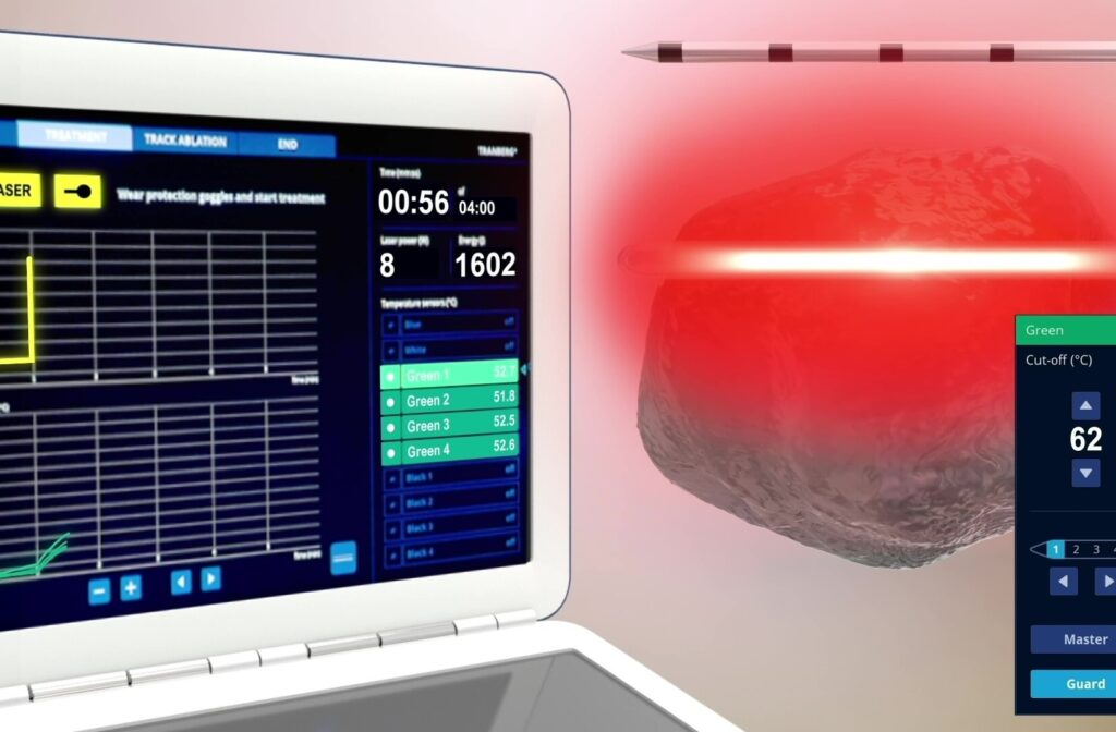 Thermoguide Workstation is used for treatment monitoring and control. Its thermometry software continuously provides near real-time temperature maps and tissue damage estimates. The procedure is initiated by pre-setting planned treatment parameters on the TRANBERG® Mobile Laser Unit with touch controls on two screens. When US-fusion imaging is used to guide the procedure, TRANBERG® Tissue Temperature Probes are used to monitor and control the ablation as an alternative to the Thermoguide Workstation.